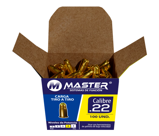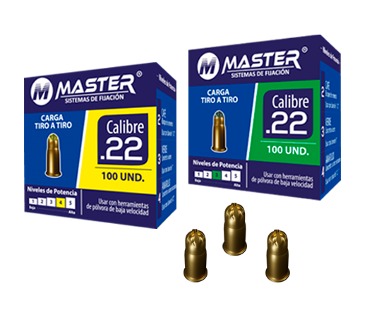 Las cargas calibre 0.22 están especialmente fabricadas para usarse con la herramienta MASTER DG307, el nivel de potencia de las cargas está indicado por el número marcado en cada caja, el color de la caja y el color de la punta de cada carga, a medida que aumenta el número, también aumenta el nivel de potencia de la carga, realice siempre una fijación de prueba usando primero una carga de nivel de potencia más bajo.